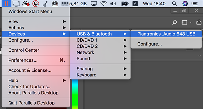 - If Windows is running in Coherence, click the Parallels Desktop icon in the menu bar > Devices > USB & Bluetooth > and select the device you want to connect.