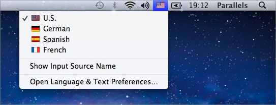 While you're working with Windows or any Windows applications, Parallels Desktop shows the input language set in Windows in macOS menu bar. You may find it useful while working with Windows in Coherence when the guest OS desktop is hidden.
